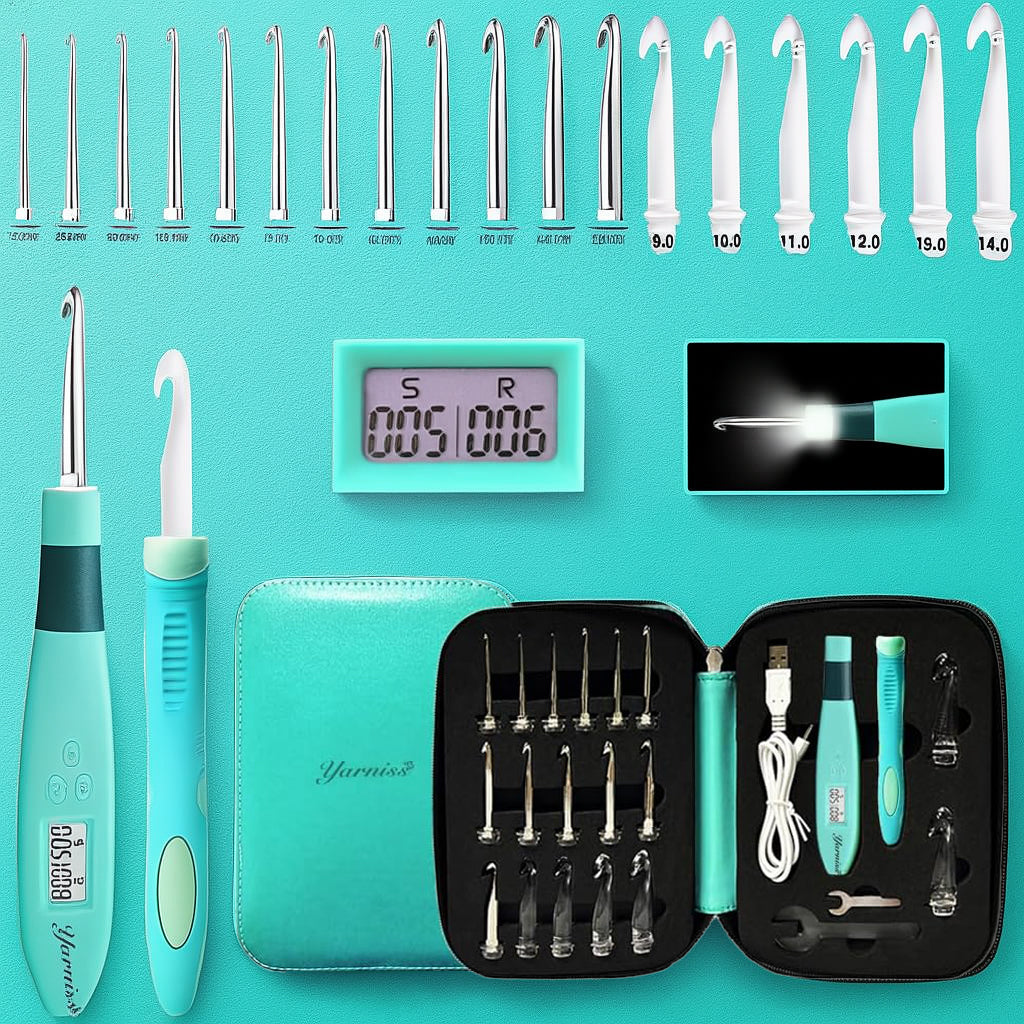 Yarniss 18 Size Counting Crochet Hooks with Light, Digital Counter Crochet Hooks Set with Case (2.0mm~14.0mm)