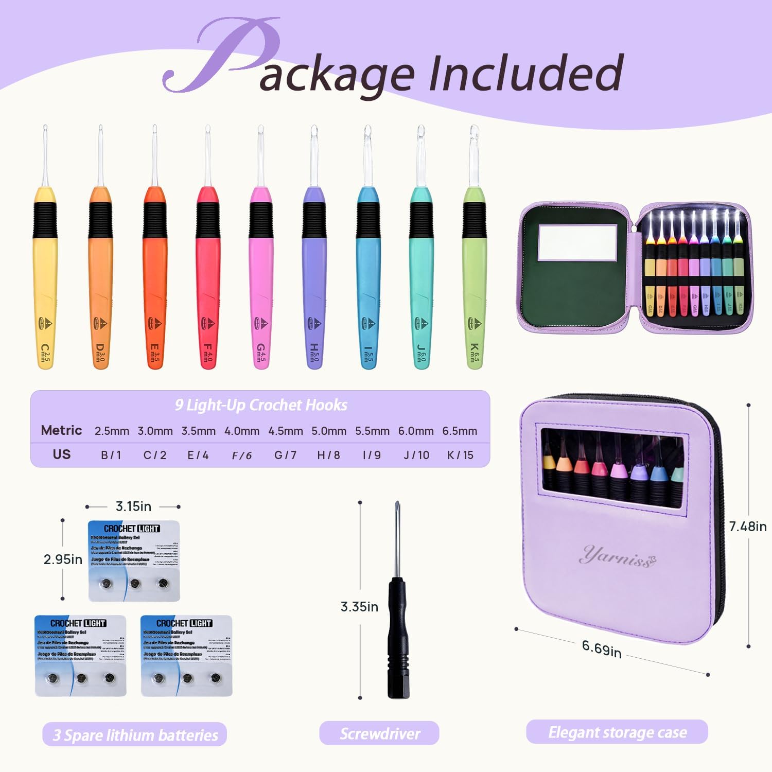 - 9 LED Lighted Hooks for Precision Work:(Includes nine essential sizes from 2.5mm to 6.5mm. The bright LED light at the hook tip illuminates stitches clearly, even in dim light or with dark yarn, ensuring perfect accuracy.