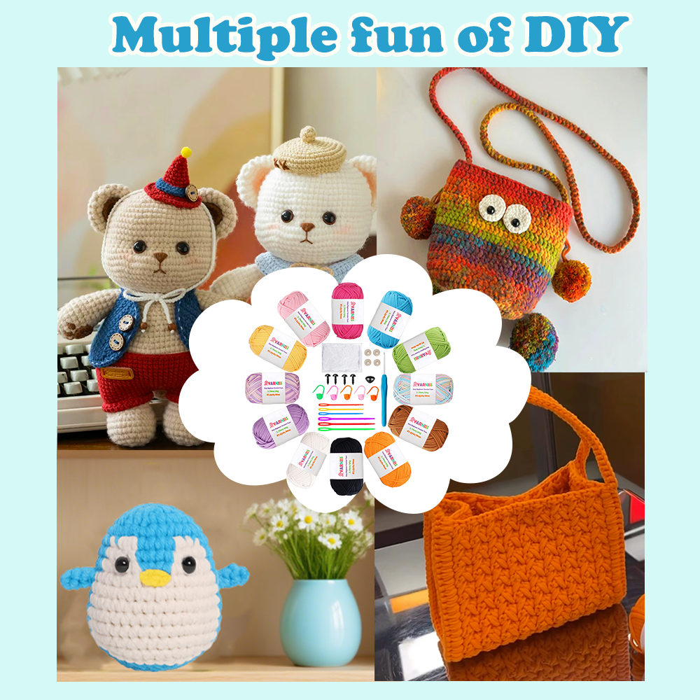 - All-In-One Basic Crochet Kit: Includes 4mm hook,stuffing,plastic knitting needle,5 locking stitch markers,4 animal eyes.No fixed patterns—create unique projects freely without extra accessory purchases.