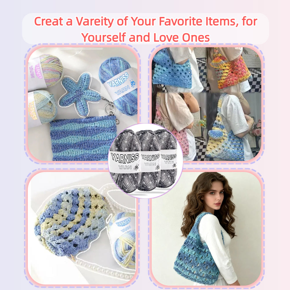 - 5.Versatile For Numerous Creations: Yarniss versatile sparkle yarn is an excellent choice for crafting beautiful bag, unique accessories, and home decor items. Its subtle shimmer adds a touch of elegance to any handmade project, perfect for personal use or as a heartfelt gift.